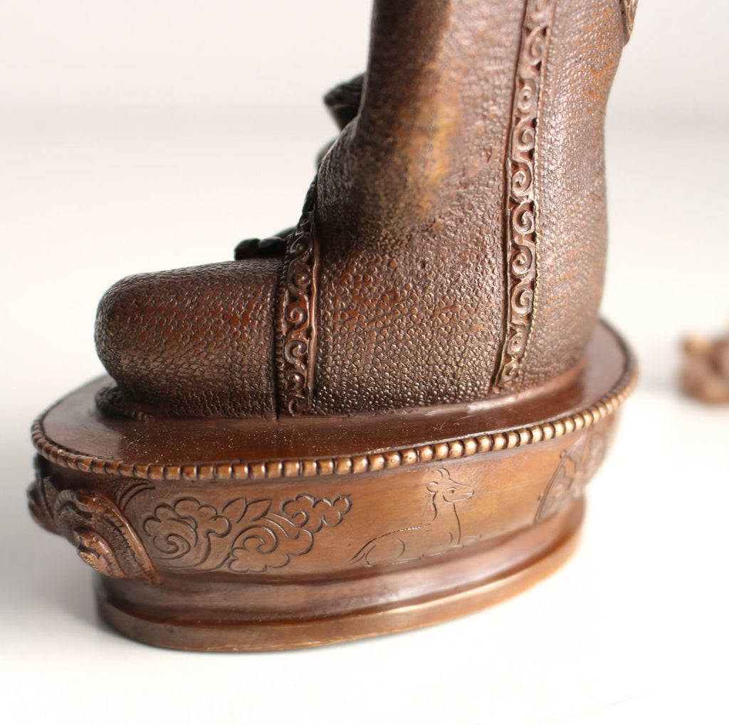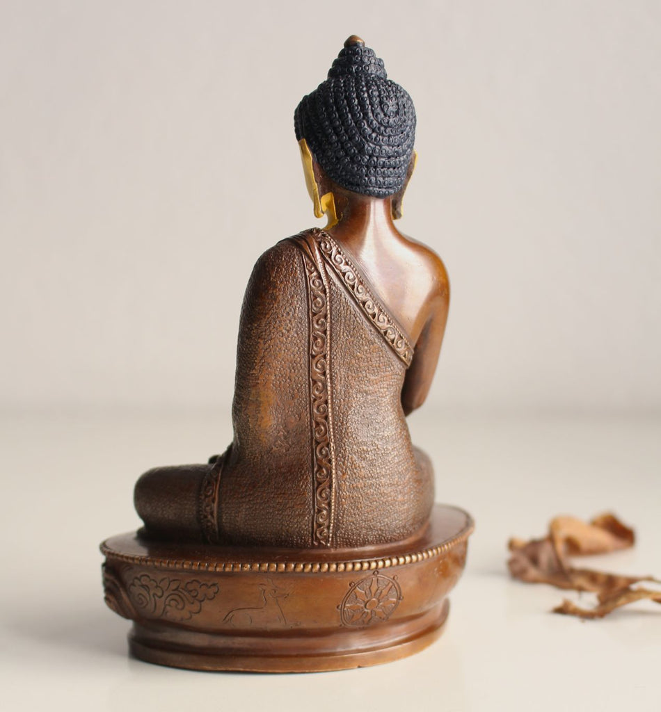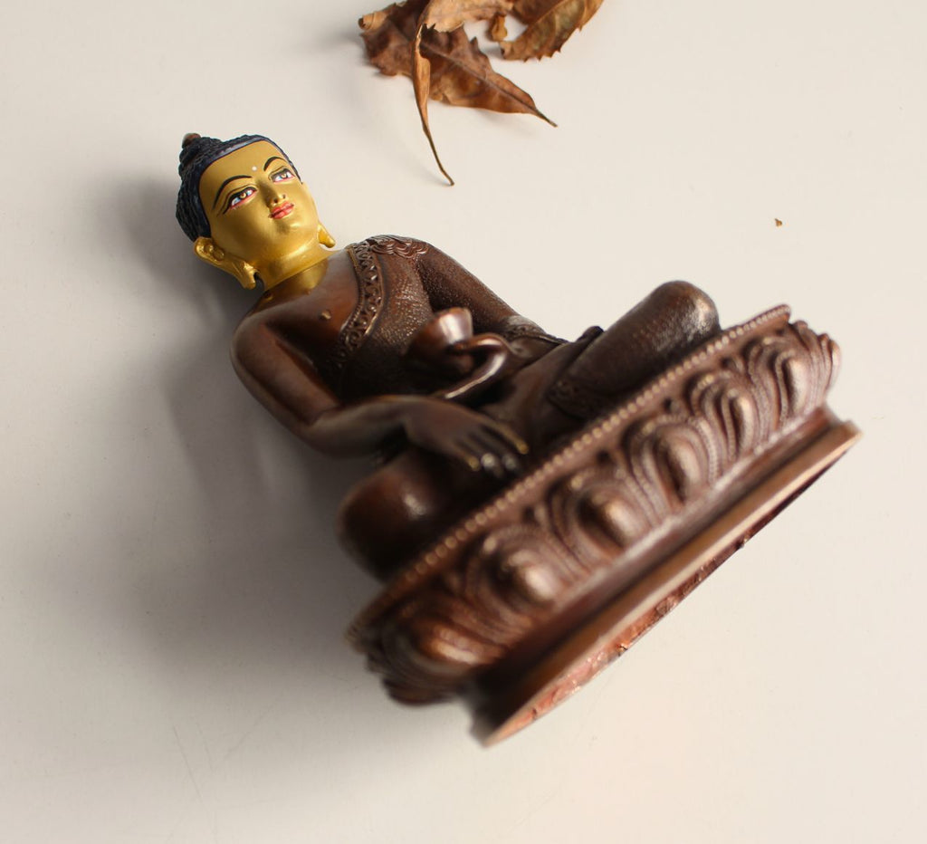 This is a 5.5 inch high copper oxidized statue of Shakyamuni Buddha. Despite the small size of this statue, the work of carving and face painting is very intricate. The robe of Buddha has been dot carved meticulously. The golden face painting has been done beautifully.
